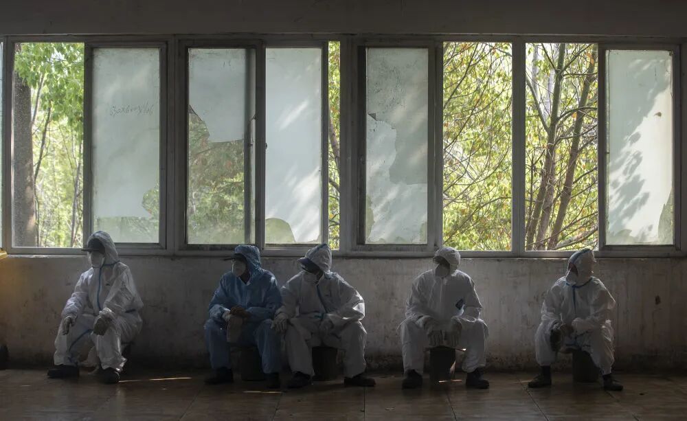 在方舱的一角,我突然发现了两位医护人员,她们就在那里坐着,互相依偎着,像是一尊雕像。