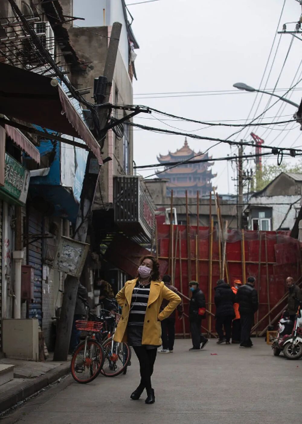 4月2日,在武汉黄鹤楼附近的武汉西城壕社区,一位女士在练习模特步。
