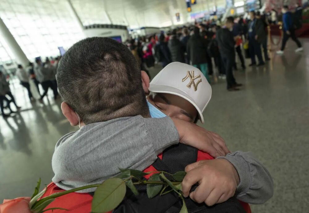 3月19日,在武汉天河机场,河南医疗队队员郭燕姿紧紧抱住丈夫王国晓。夫妻二人都来自河南新乡,王国晓是医生,郭燕姿是护士长。2月9日,夫妻俩驰援武汉,随后,郭燕姿被分配到青山方舱医院工作,而王国晓则被分配到了另外一个区。从那以后,夫妻俩已有一个多月没有见面。3月19日当天,夫妻俩在机场重逢。