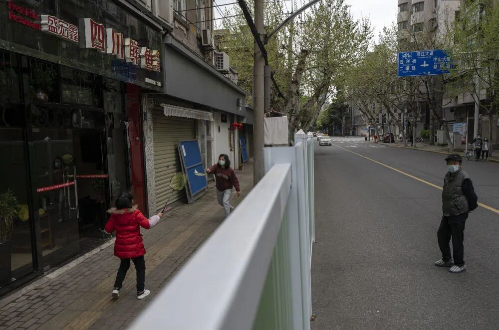 4月1日,在武汉的一个社区里,人们在隔离墙内打打羽毛球。