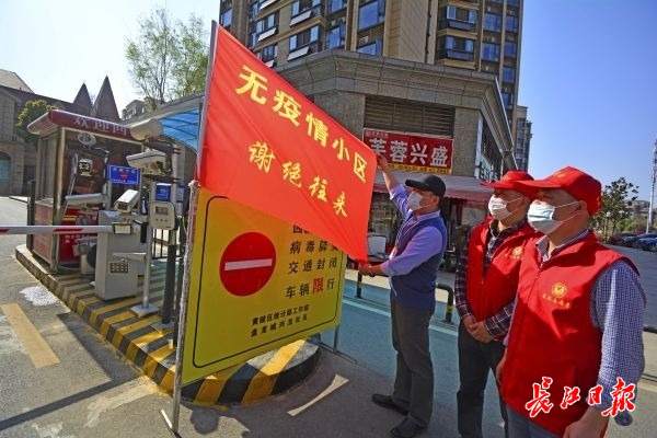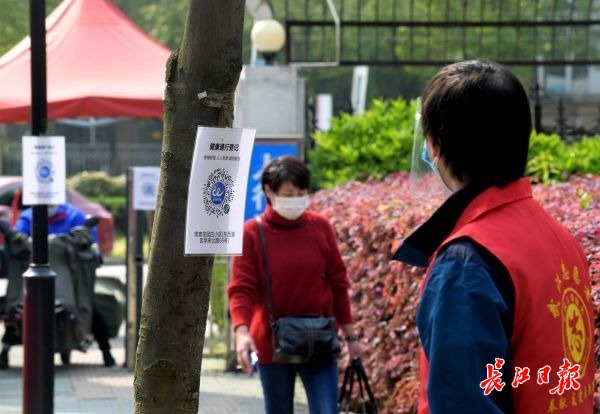 黄陂区盘龙城兴龙社区,区文旅局12名下沉党员干部每天坚守岗位,和物业、社区工作人员一起共抓“四必”管理,对进出小区人员“身份必问”“体温必测”“信息必录”“口罩必戴”,居民出行、上班凭健康码或社区出具的健康证明和单位出具的复工复产证明出行。 (记者杨涛 摄影报道)