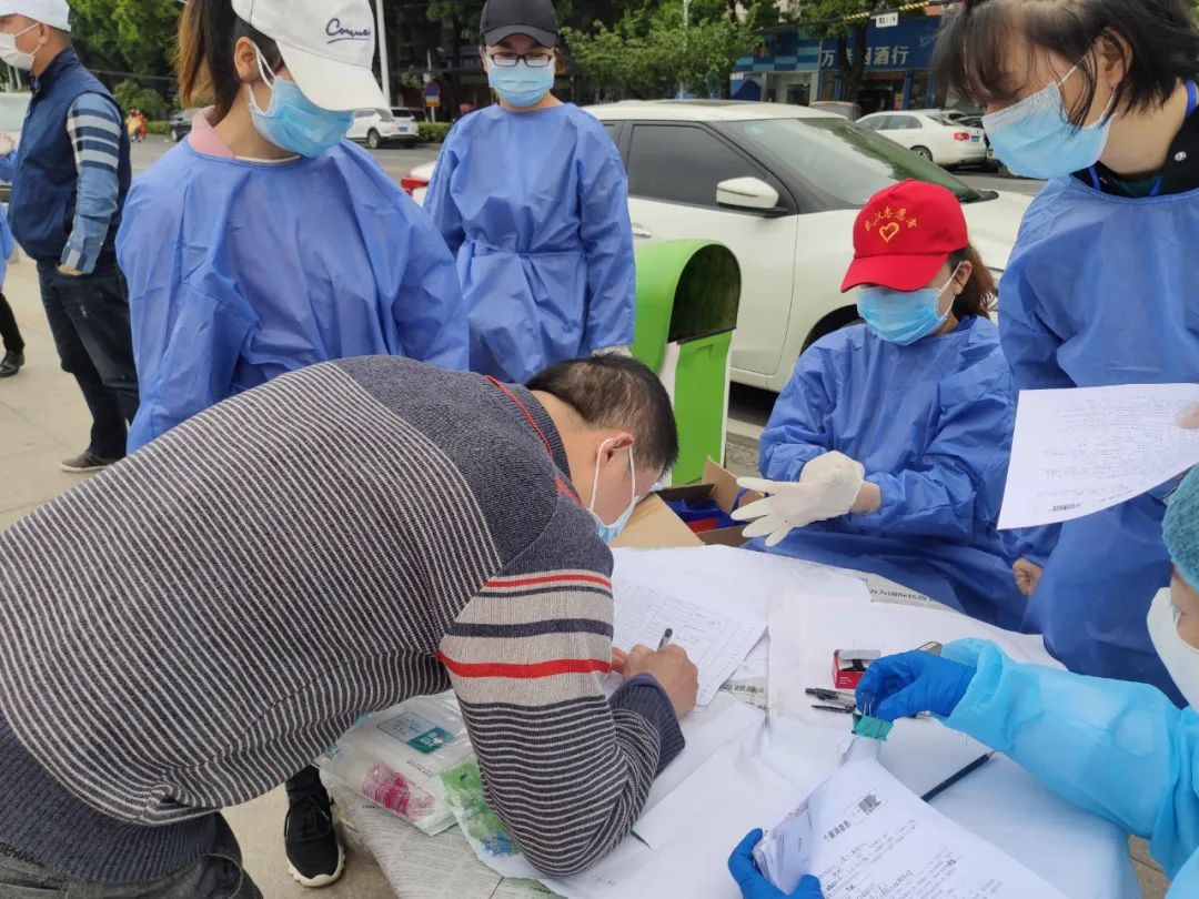 今日上午9时许,江夏区体育馆前,110人排队,依次抽血、查咽拭子,参加武汉市居民新冠病毒血清流行病学调查。