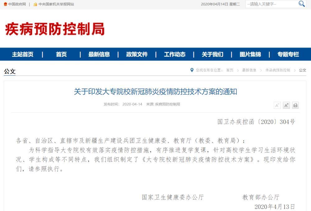 为科学指导大专院校有效落实疫情防控措施,有序推进复学复课,针对高校学生学习生活环境状况、学生构成等不同特点,国家卫生健康委办公厅、教育部办公厅组织制定了《大专院校新冠肺炎疫情防控技术方案》。其中明确,学校食堂采取错峰用餐,用餐桌椅同向单人单座并保持间隔1.5米;学生宿舍床位重新分配,减少人员并拉开距离;图书馆和实验室等公共场所实行人员限流。
