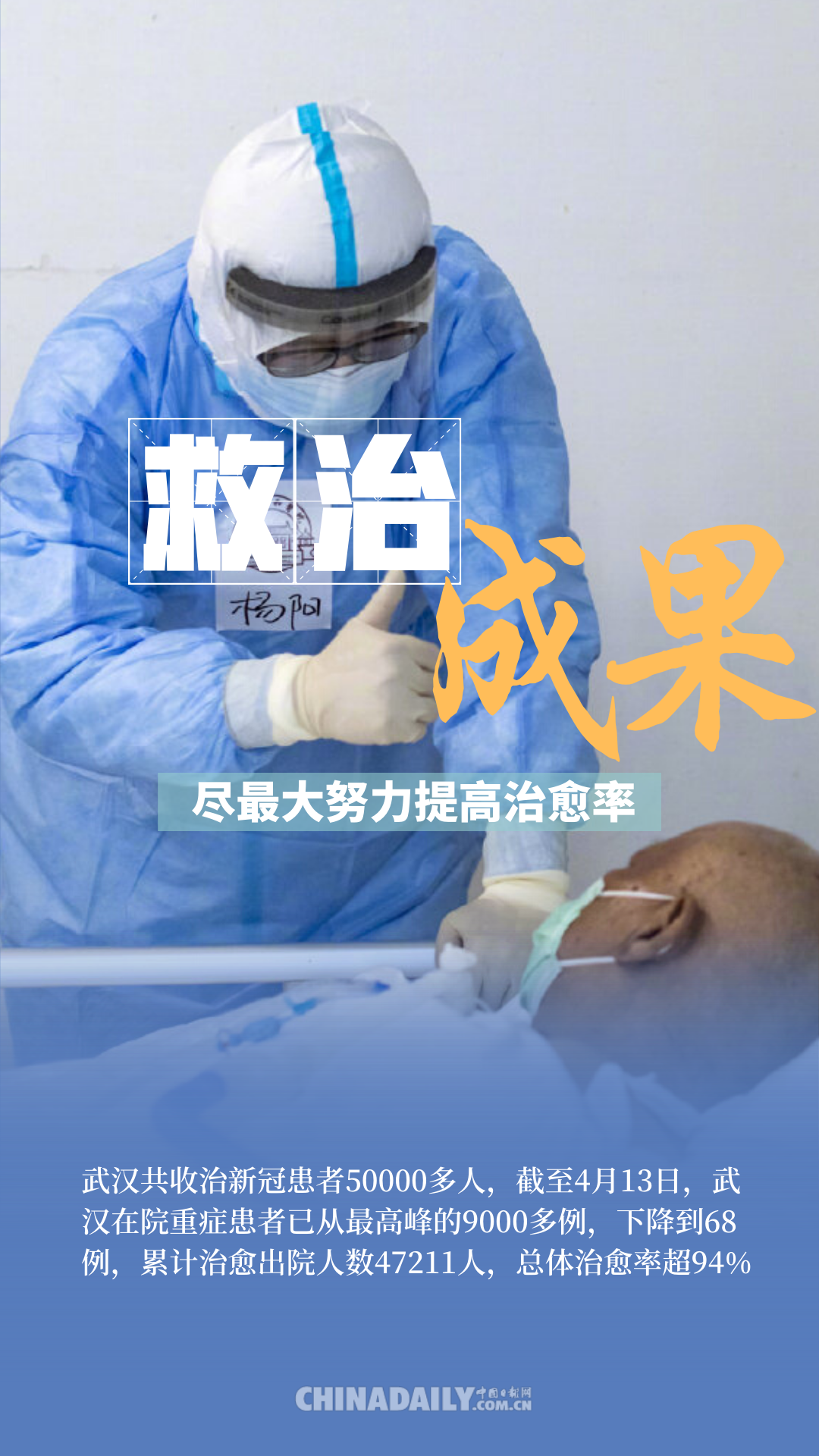 随着新冠疫情在世界范围内加速蔓延,截至4月14日,全球新冠肺炎确诊病例已超190万例。中国防疫阻击战的阶段性胜利,尤其是武汉的解封,备受世界瞩目,也为世界战疫胜利带来了信心与希望。据统计,武汉总共收治新冠患者50000多人,其中,80岁以上患者3000多人,8位超过100岁的患者中,已有7人治愈出院。截至4月13日,武汉现有确诊病例降至218人,在院重症患者已从最高峰的9000多例,下降到68例,累计治愈出院人数47211人,治愈率超94%。