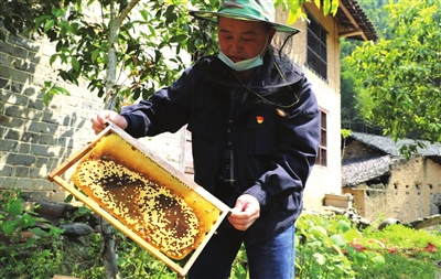 二组王必珍,今年70岁,是建档立卡贫困户。1990年右手截肢,靠养几箱蜜蜂度生,并不断投资蜂业。他介绍,养蜂是个好产业,他虽然手不方便,但活儿不累。他与记者算起账。他说,一个蜂箱有5个框,一个框摇糖1到1.5斤。一个箱一年摇糖3到4次,每斤糖按50元计算,20个箱就是2万多元。深山无污染,一年四季有蜜源,九月黄、牛藤、勾藤、芙蓉花等,就是冬天,也有柃木开花。