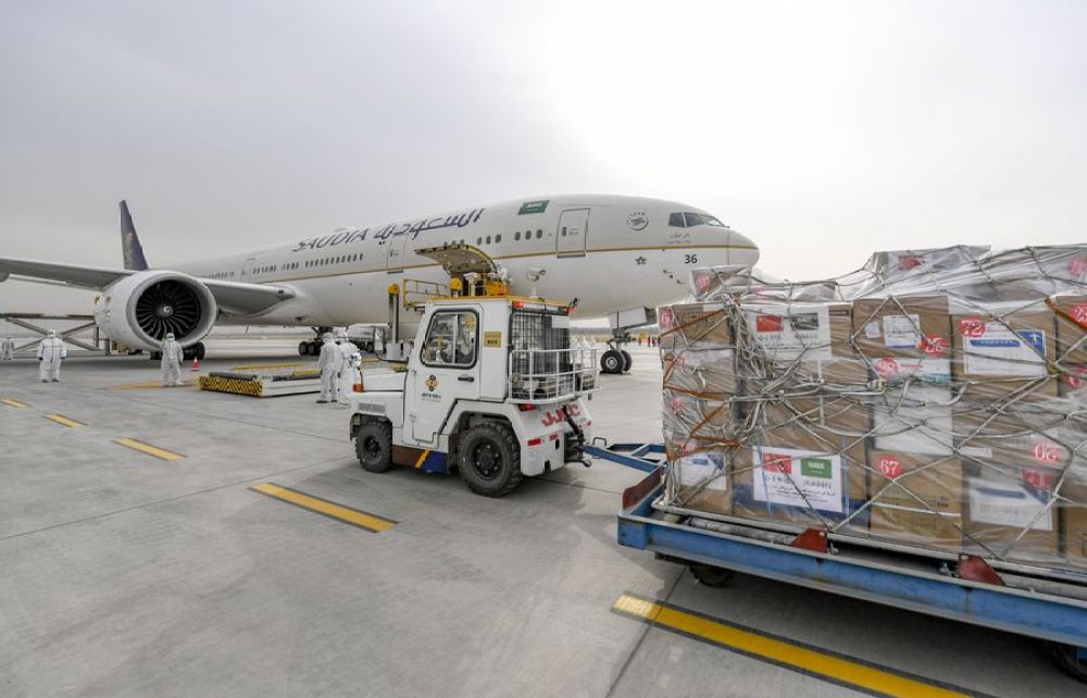 4月15日,工作人员在装运援助沙特阿拉伯的医疗物资。新华社记者 冯开华 摄