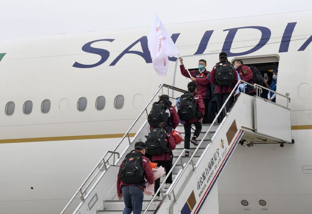 4月15日,中国赴沙特阿拉伯抗疫医疗专家组成员在银川河东国际机场登机启程。新华社记者 冯开华 摄