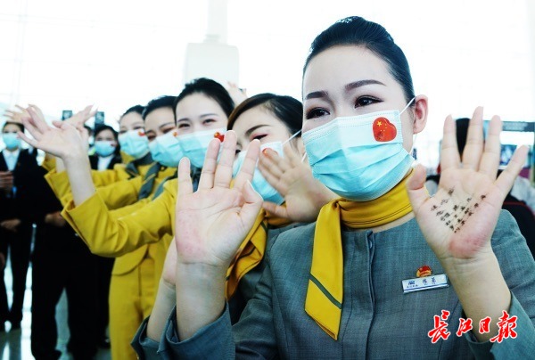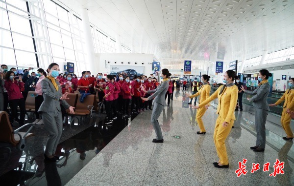 长江网4月16日讯 15日13时许, 随着最后撤离的北京协和医院援鄂医疗队180多名队员登机离汉返京,湖北机场集团实业商旅公司的共青团员送别援鄂医护人员志愿队,完成全部送别任务。(记者何晓刚 通讯员李伟 黄宇燕 摄影报道)