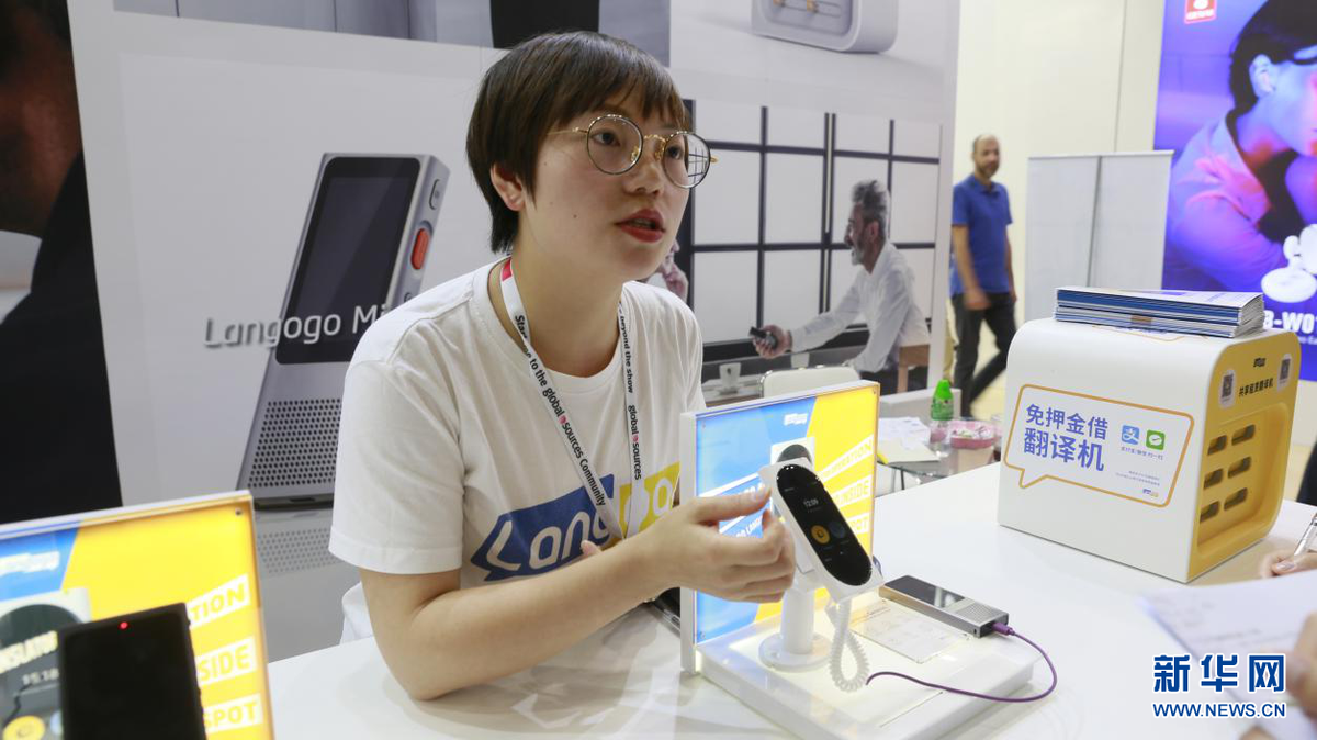 “2019环球资源移动电子展”日前在香港亚洲国际博览馆举行。本次展会聚焦移动设备、可穿戴、移动配件等创新电子产品,并针对5G时代特设了AIOT PARK展区以及创客展和科技礼品展等,总体规模逾3700个展位。图为来自中国内地的参展企业工作人员在介绍AI语音同声翻译机,该翻译机结合了神经网络系统AI技术,支持超过100种语言的实时翻译、同步对话。(新华网亚太传播运营中心供图)