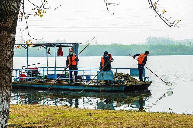 白云湖水管处积极响应爱国卫生倡议,每天组织工人开展湖面垃圾清捞,每周打捞垃圾和漂浮物近万公斤,营造白云湖一湖两岸洁美景观。(随州日报全媒记者李文军摄)