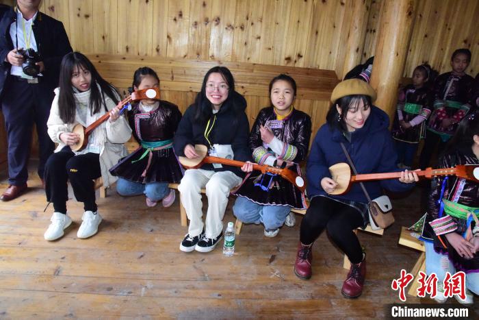 图为香港青少年体验学习侗族琵琶乐器。 李刚 摄