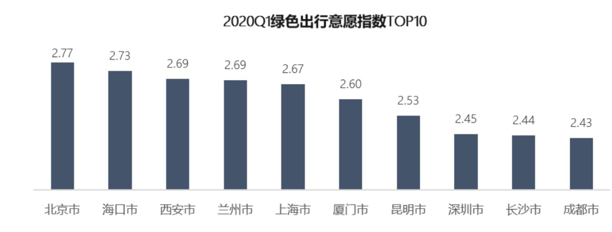 此外,报告显示,受春运和疫情影响,全国主要城市绿色出行意愿在1月份逐步下降,而后稳定。其中,公交&地铁出行意愿指数在春节前快速下降,而同期骑行出行意愿指数快速上升。2020年一季度,北京绿色出行意愿指数排名第一。从各类绿色出行方式来看,公交&地铁、骑行、步行出行意愿排名第一的城市分别为北京市、海口市、兰州市。