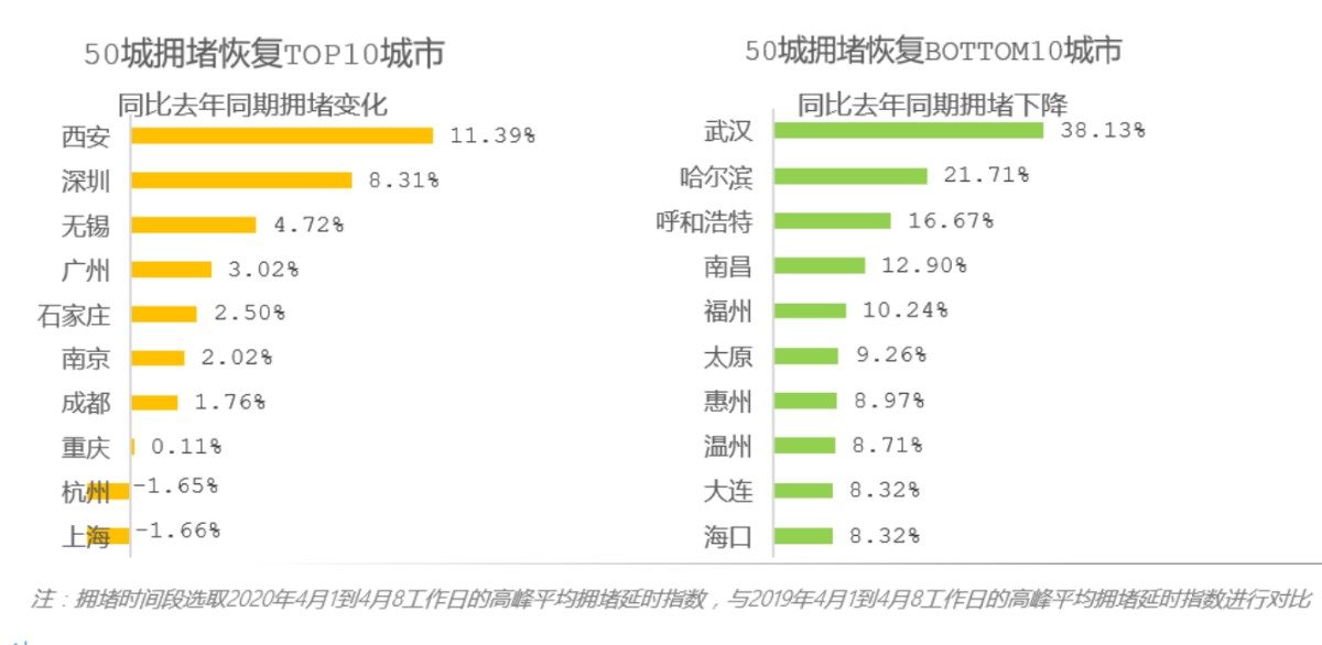 从全国拥堵恢复地图可以看出:华东、西北地区拥堵恢复状况较好,东北、华北相对较慢。在主要城市中西安、深圳、无锡、广州、石家庄等城市恢复最快,已超过去年同期的拥堵水平,杭州和上海拥堵恢复未及去年同期。同时,仍有不足1%的城市交通未恢复至去年同期的80%,其中以武汉、哈尔滨较为典型。