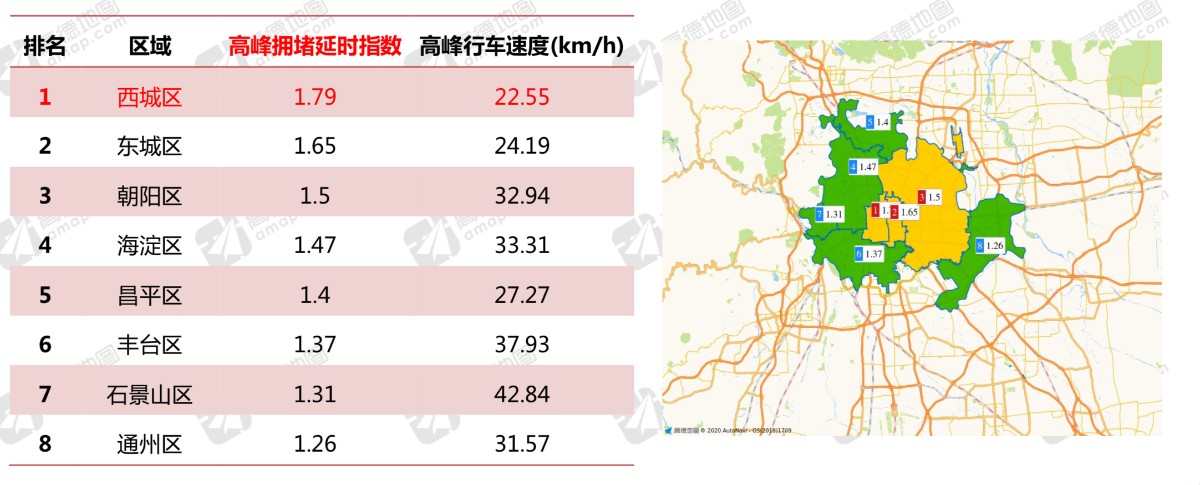 具体来看,北京一月拥堵最严重,高峰期拥堵延时指数1.75,高峰期城市平均行车速度27.07km/h,18:00是一天中最拥堵时刻。西城区是北京城市最拥堵区域,菜户营南路成为拥堵天数最多的道路,一季度有25天拥堵。