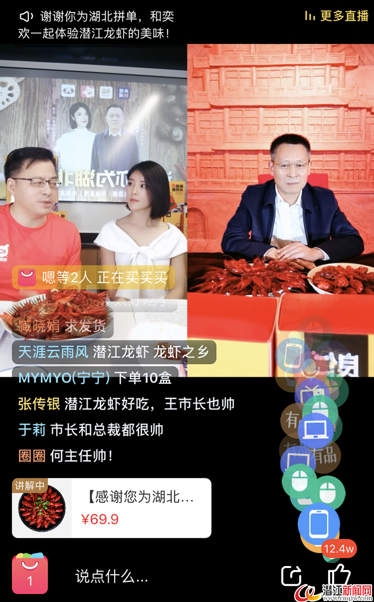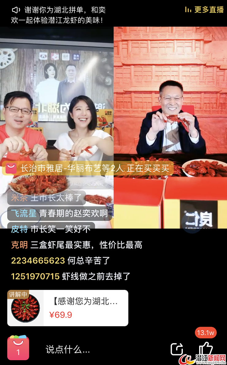 “养殖是生态的,标准是一流的,检测是100%合格的,潜江小龙虾是名副其实的绿色生态食品!”20:00,潜江市副市长王绪军连麦演员赵奕欢现身直播间,通过对潜江小龙虾做全方位讲解,亲自为潜江特产代言。