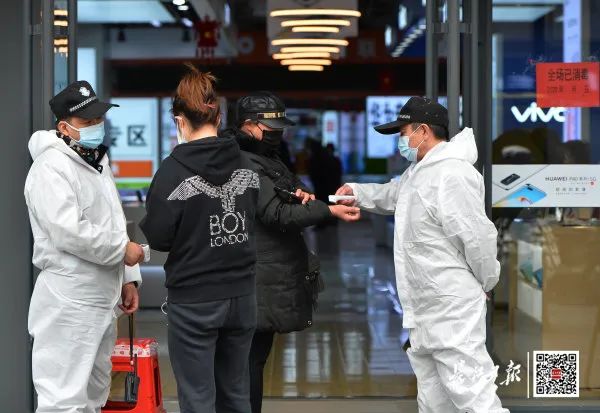 4月11日,在大智路路通信市场,保安正在检查顾客的绿码和测体温。长江日报记者喻志勇 摄