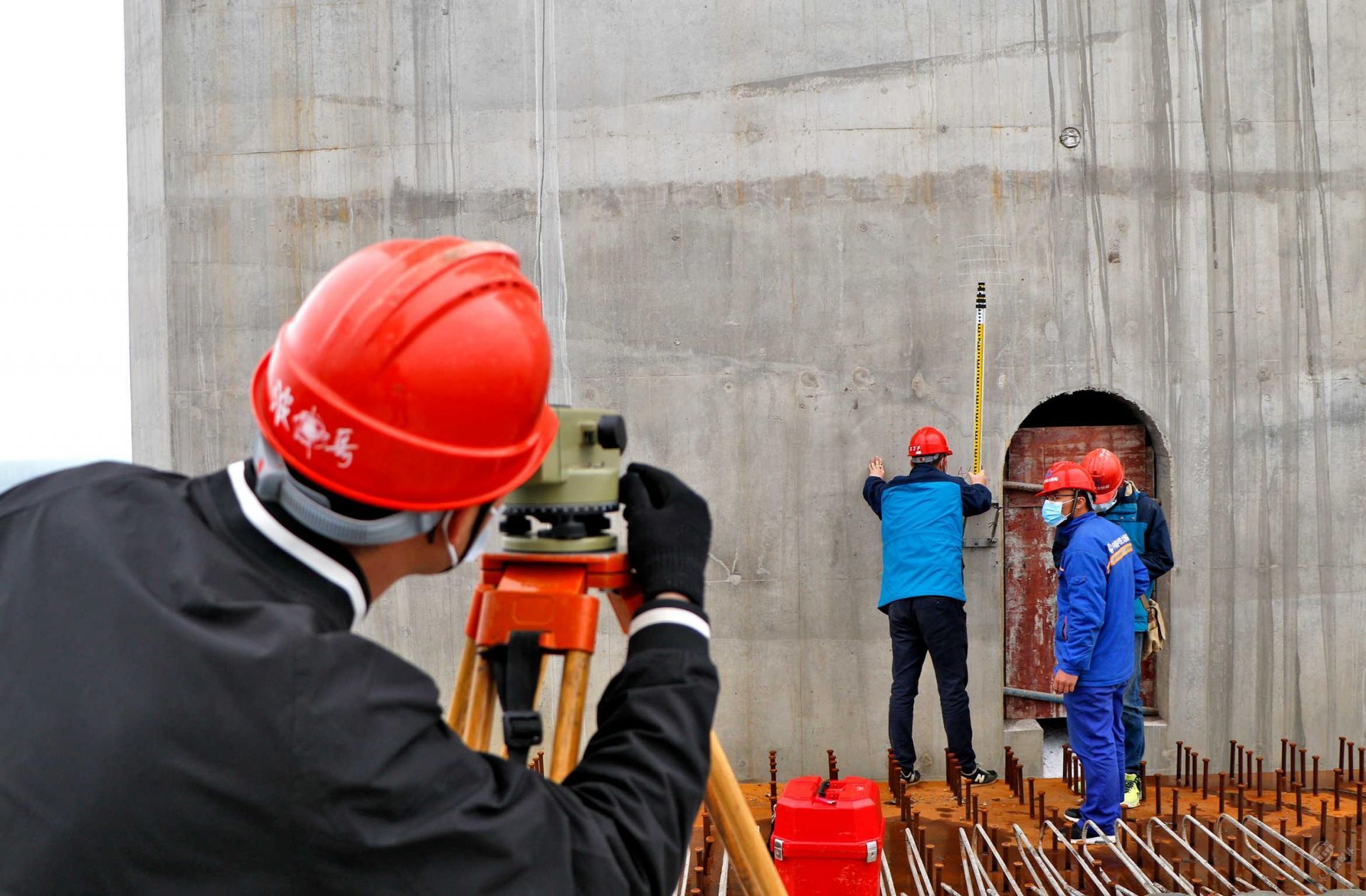 4月21日,赤壁长江公路大桥项目建设现场,技术人员为确保钢梁准确吊装,正在进行定位测量。