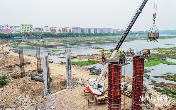 4月22日,位于曾都区府河镇的长张线(S327省道)府河大桥危桥改造工程正在紧张施工中,工人正在向高高竖起的桥墩上浇筑水泥。据悉,府河大桥拆除重建项目是曾都区2019年重点交通建设项目之一,该桥是连接广水市长岭镇和曾都区府河镇的重要通道,也是S327长张线(长岭、府河、洛阳至京山)的重要交通设施。(随州日报全媒记者李文军摄)