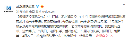 武汉地铁官方微博发布武汉地铁2号线、4号线疫情防控信息公示:多个站点检测结果为阴性。