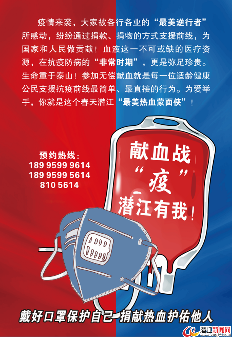 潜江城区固定献血点:中百献血房车8105614(9:00-16:30);油田矿区流动献血车:广华献血车18995999614,向阳献血车18995995614。献血时间为每日9:00-16:30,节假日不休。市血站提醒,为避免献血者聚集,市民可通过拨打电话的方式提前预约好时间,在做好个人防护的前提下,按照市血站工作人员的引导安全有序,分批次、分时段进行献血。市血站可为达到30人的团体献血单位提供献血车上门服务。