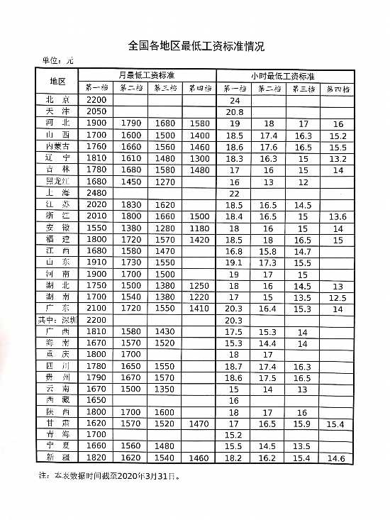 数据显示,截至2020年3月31日,上海、北京、广东、天津、江苏、浙江6省份的第一档月最低工资标准超过2000元。其中,上海最高为2480元。