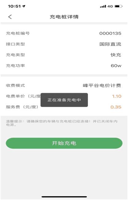 扫描二维码后出现以下界面,点击开始充电后,提示正在准备充电中,此时请耐心等待10秒。