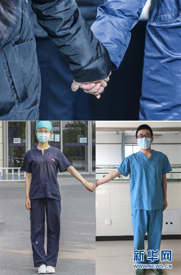 拼版照片:2月6日,北京大学国际医院医生付雪莹与丈夫张立朋在医院告别时牵手(上图);4月28日和4月30日,付雪莹和丈夫张立朋在各自的工作岗位上隔空拉手(下图)。