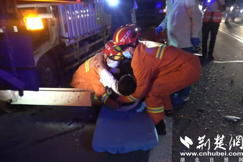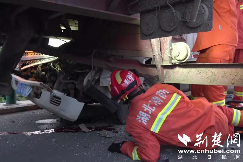 荆楚网客户端—荆楚网消息(通讯员 魏子豪 李逸)5月5日18时许,天门市沪蓉高速936公里处一辆小货车追尾大货车,2人被困车中,接到报警后,天门市竟陵消防救援站立即出动1车6人前往救援,同时并通知交警及120协同救援。