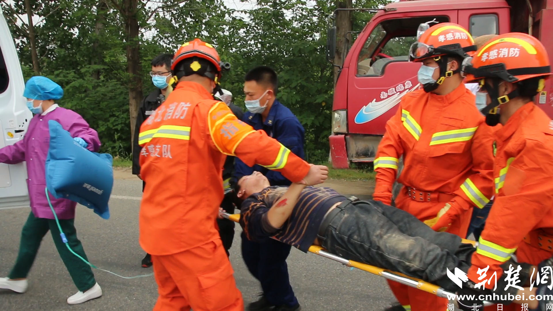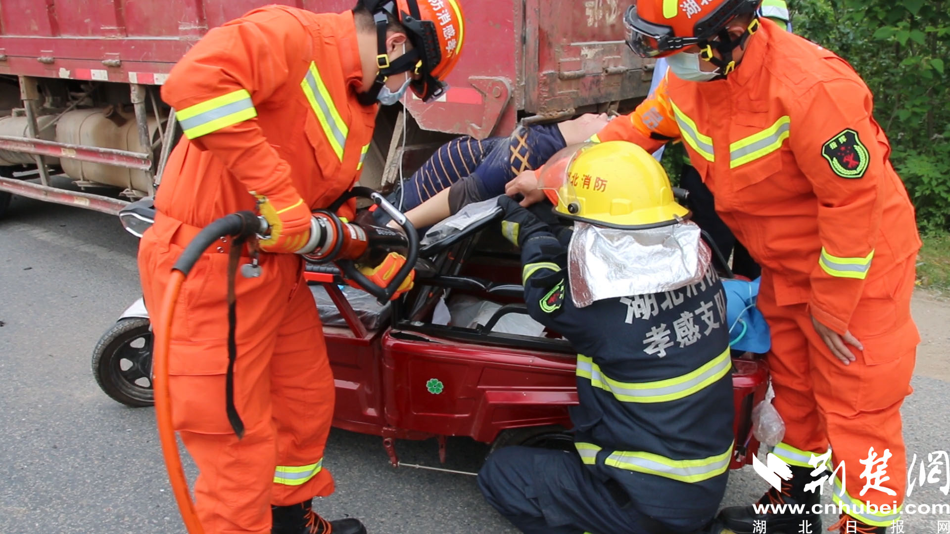 荆楚网客户端—荆楚网消息(通讯员 付传虎)5月6日上午11时36分,在孝感市孝昌县南大桥附近一辆三轮摩托车和一辆载满水泥的货车发生追尾,三轮车司机被卡在货车车厢下面。接到报警后,孝感市消防救援支队迅速调派孝昌消防站6名消防员赶往现场处置。
