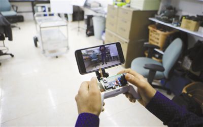 近日,巴勒斯坦工程师尤斯里·塔尔德研发出一种“快递机器人”,可为在医院隔离治疗的新冠病人提供快递食物和药品服务。该机器人由传感器、摄像头、GPS定位追踪器、雷达等部件组成。图为尤斯里·塔尔德操作“快递机器人”。
