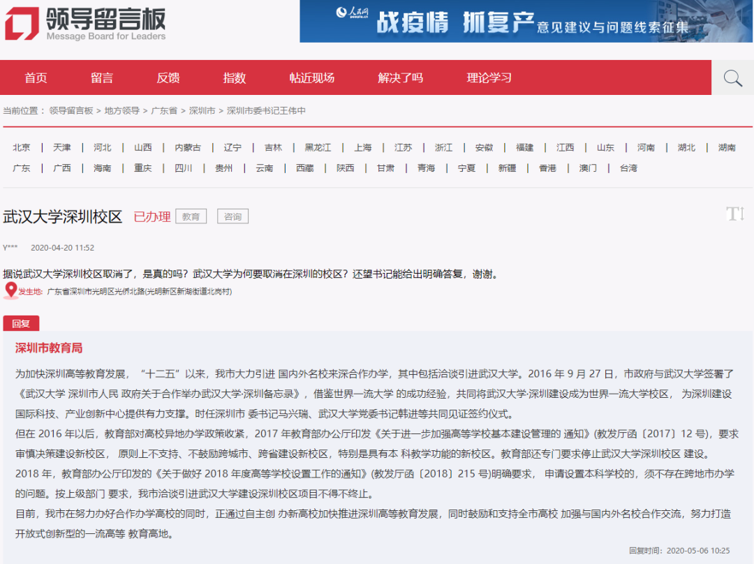 长江云微信公号5月8日消息,近日,有网友在人民网领导留言板向深圳市委书记提问武汉大学深圳校区情况。网友询问了武汉大学深圳校区取消的消息是否属实,以及武汉大学取消深圳校区的原因。深圳市教育局回复了网友提问,具体问答内容如下: