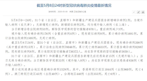 人民网北京5月9日电(董童)国家卫生健康委于9日在官网发布的《截至5月8日24时新型冠状病毒肺炎疫情最新情况》(以下简称“情况”)称,5月8日0—24时,31个省(自治区、直辖市)和新疆生产建设兵团报告新增确诊病例1例,为境外输入病例(在天津);无新增死亡病例;新增疑似病例2例,均为境外输入病例(在上海)。当日新增治愈出院病例53例,解除医学观察的密切接触者670人,重症病例减少3例。境外输入现有确诊病例176例(含重症病例4例),现有疑似病例8例。累计确诊病例1681例,累计治愈出院病例1505例,无死亡病例。