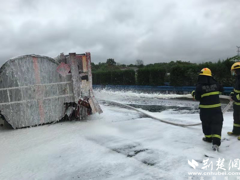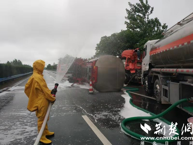 荆楚网客户端—荆楚网消息(通讯员 张智彬)2020年5月8日8时39分许,大广高速浠水路段一辆车牌为皖C2087挂载有30吨乙醇槽罐车因车辆失控发生侧翻泄漏,湖北省黄冈市浠水县消防救援大队接警后,迅速出动2台消防车、10名消防救援人员赶赴现场进行处置。