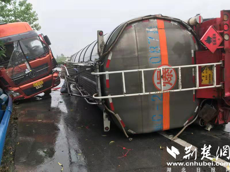 据司机介绍,该车从安徽蚌埠到湖北黄石,发生事故时遇到暴雨,车辆失去控制,导致事故的发生,所幸车内2名驾驶员无生命危险。