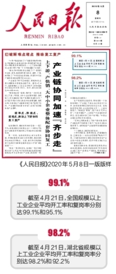 上汽通用汽车武汉工厂上游有200多家本地供应商,工厂采购部成立了6个团队,与供应商实现无缝对接。“不仅帮他们联系防疫物资,帮助协调员工返岗问题,还协助做好复工申报、现场审核等工作。”上汽通用汽车总经理王永清介绍。“以1带200”战略取得了突出成效,3月26日,上汽通用武汉工厂上游200多家供应商已全部复工,同日,武汉市14家龙头企业、820家配套企业已全部开工;截至4月28日,武汉15家年产值50亿元以上工业企业产能利用率达到95%及以上。