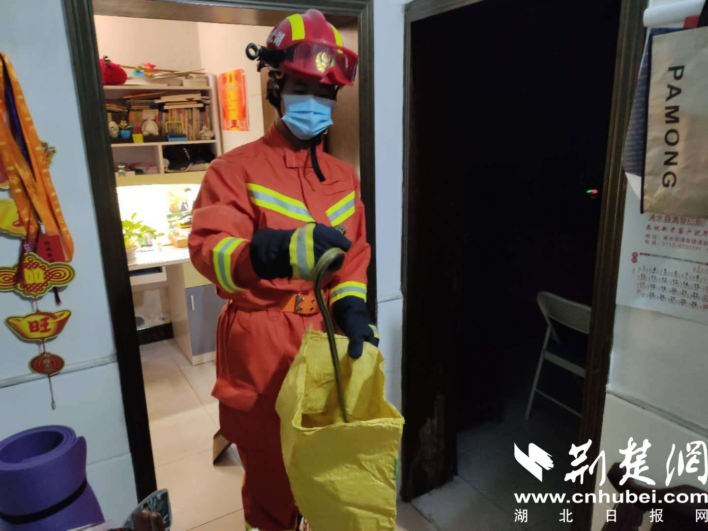 荆楚网客户端—荆楚网消息(通讯员 张智彬)5月9日晚上11时许,湖北浠水县实验中学教师住宅房间内出现了一条头型三角的蛇。由于不确定是否有毒,随即报警求助。最终,在消防指战员努力下,成功将蛇抓获。