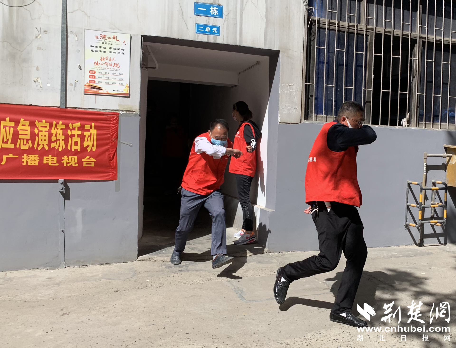襄阳市樊城区回龙寺社区,社区工作人员与居民一起开展应急疏散演练