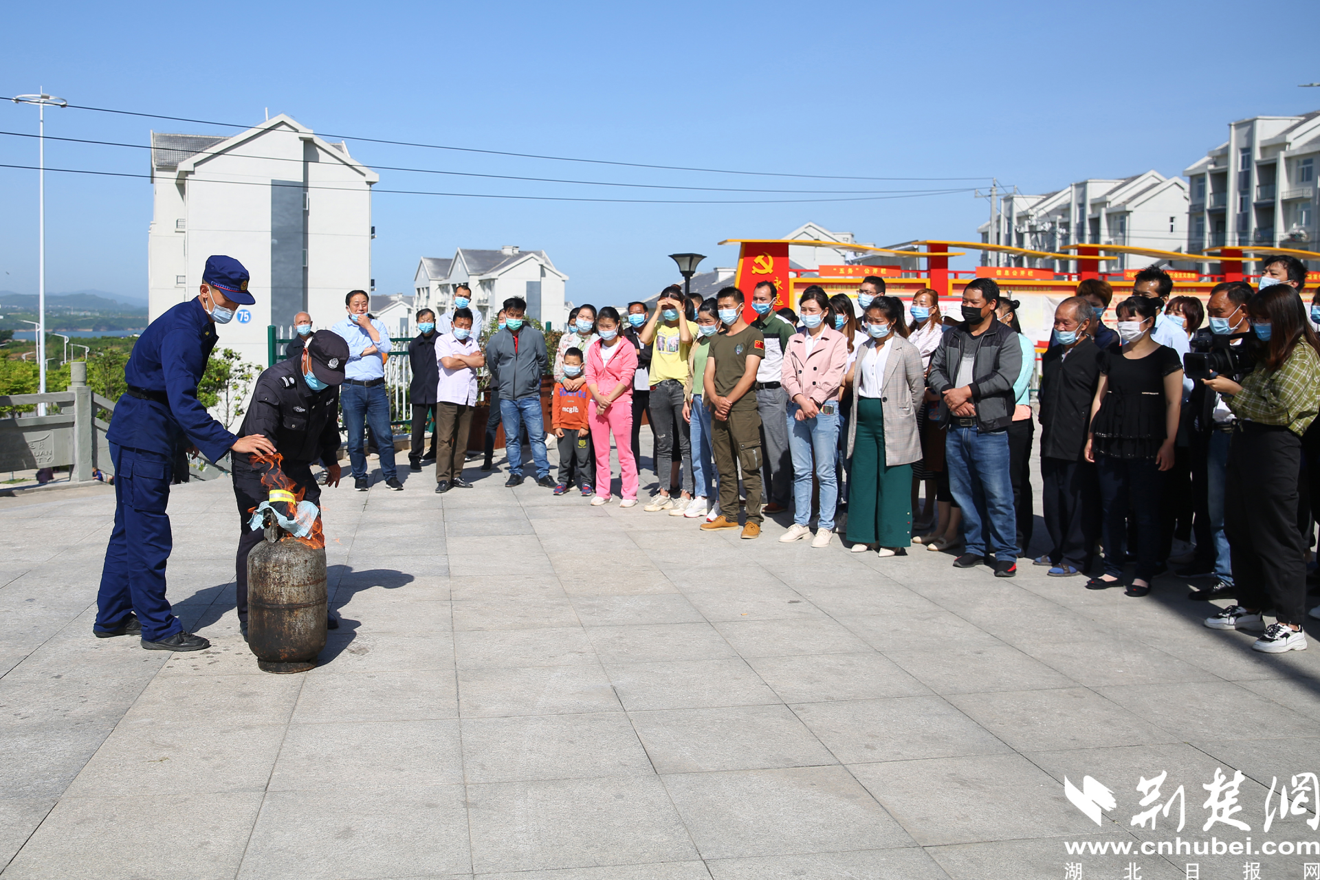 十堰市郧阳区青龙泉社区,消防员正在讲解演示如何扑救液化气罐火灾