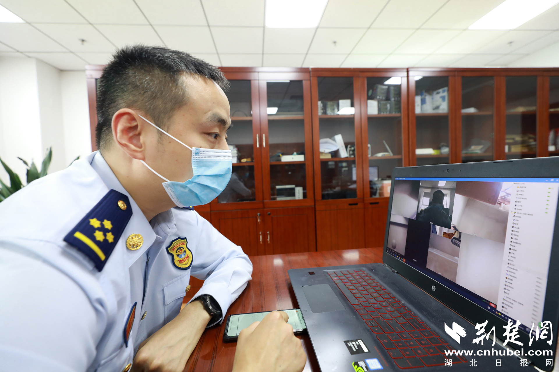 在湖北省消防救援总队,1名消防员正通过网络给武汉市第二十五中学的学生讲解应急避险与逃生自救知识