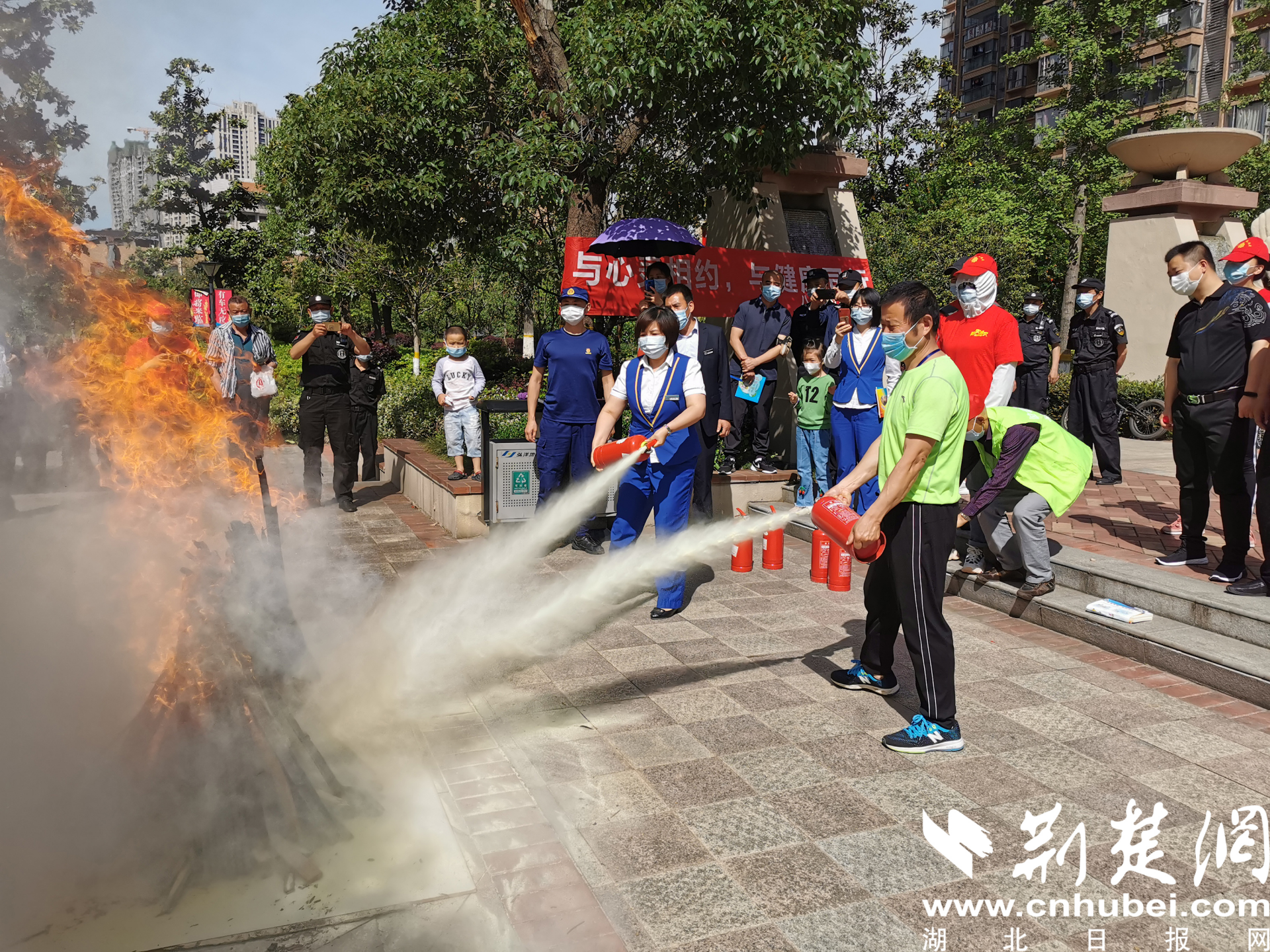 宜昌市伍家岗区八一路社区,居民正在体验利用灭火器扑救木材堆垛火灾