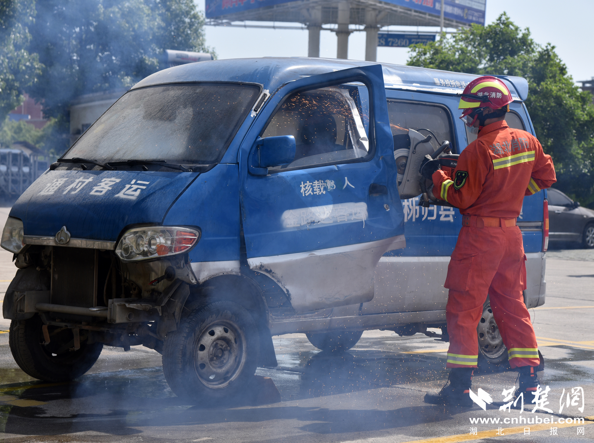宜昌市秭归县体育馆,消防员向群众演示车辆破拆救援