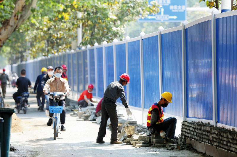 近日,随城汉东路(沿河大道至交通大道段)改造施工,预计国庆节前完工,提醒市民出行避开此路段,以免造成拥堵。图为工人们在汉东路砌筑围挡。(随州日报全媒记者徐斌摄)