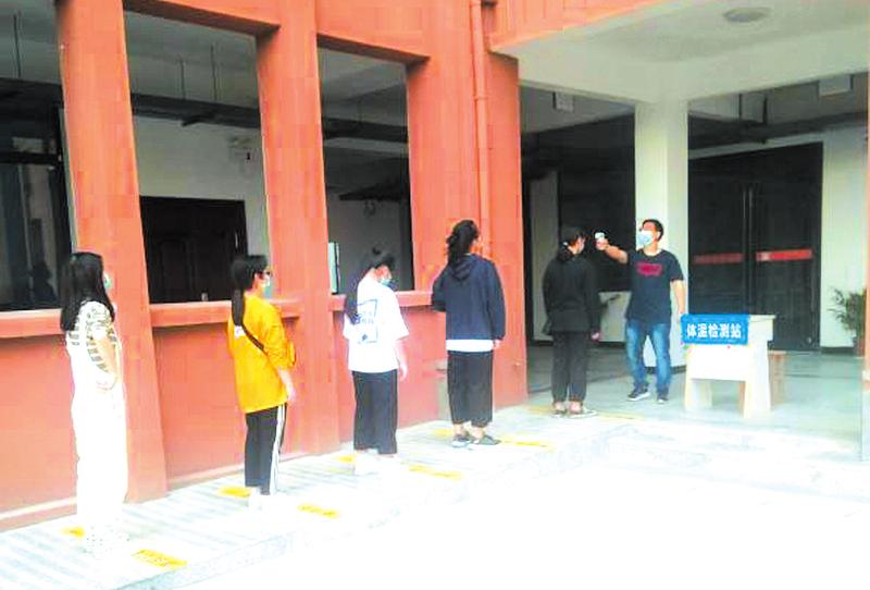 为实现学校顺利开学,近日,随县二中组织了一场针对高三学生返校复学的特别演练,学校校级领导、全体中层干部、高三教师、安保人员、后勤员工146人参加了演习活动。图为演练进入教室前排队进行体温检测。
