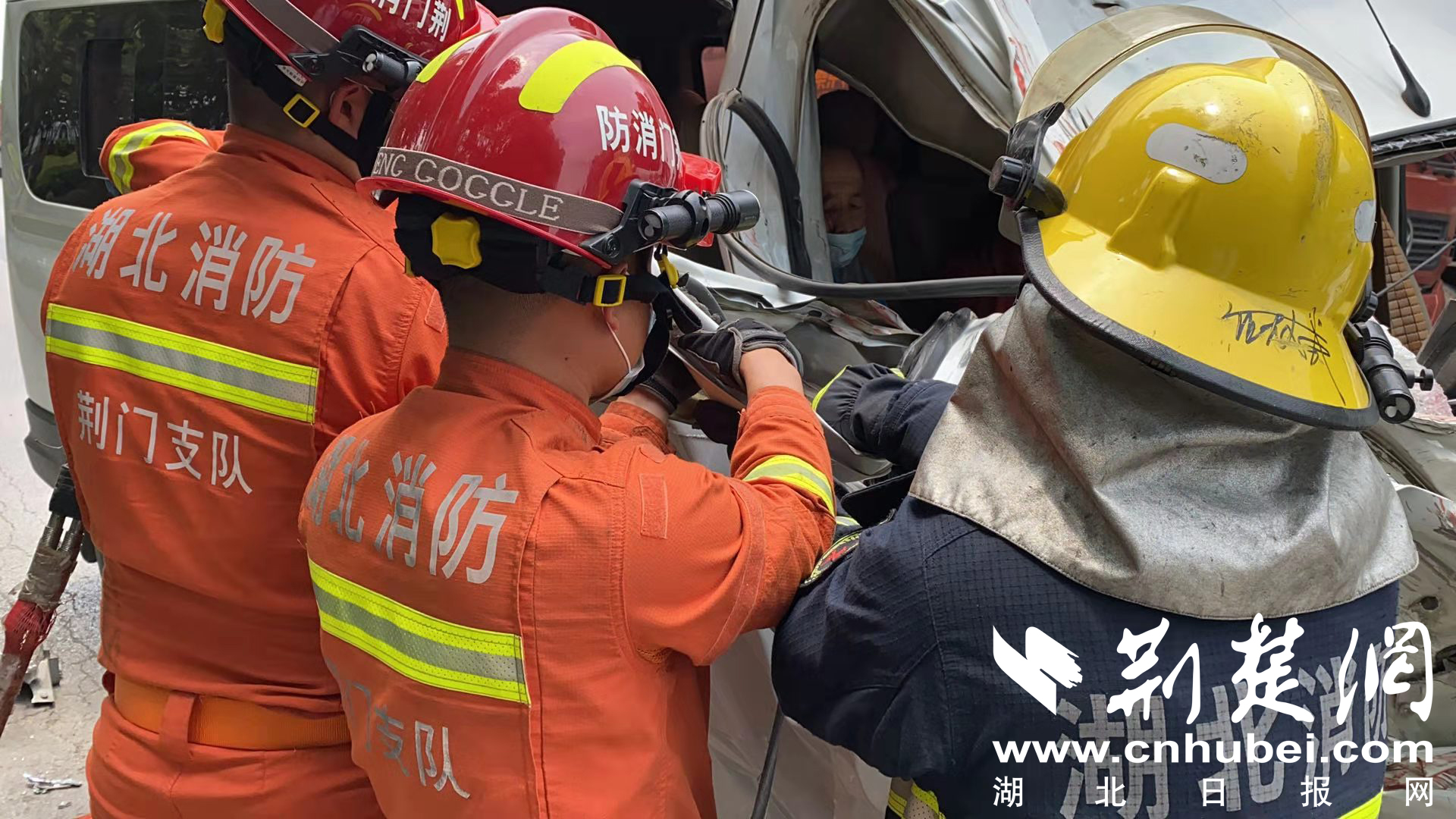 消防人员到达后发现,事故为一辆沙洋往荆门路线的客运车与货车相撞,客运车车头严重变形。根据现场情况,救援人员利用破拆工具将客车车门破拆打开后钻进客车,先将驾驶座后面的一位女子背出,随后,救援人员相继将靠近车门处的两名被困者救出,并移交给了一旁等待的医务人员。