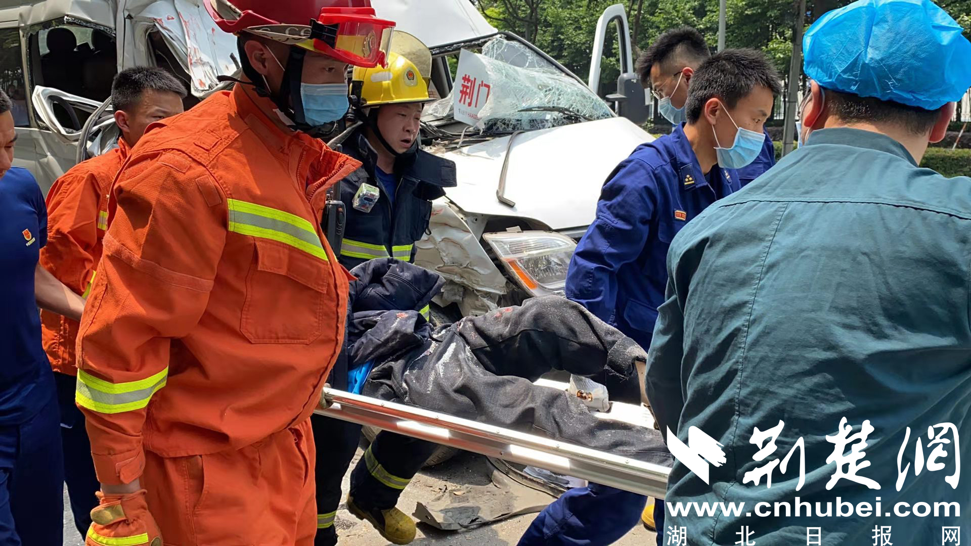 荆楚网客户端—荆楚网消息(通讯员 彭文杰)5月13日,掇刀区格林美附近发生一起两车追尾事故,荆门消防紧急救援,并迅速将被困者转交给医护人员。