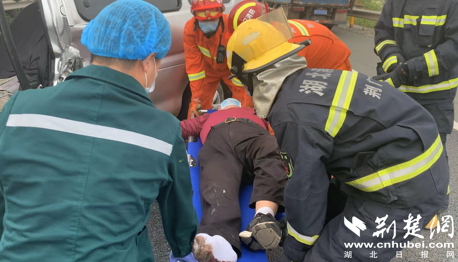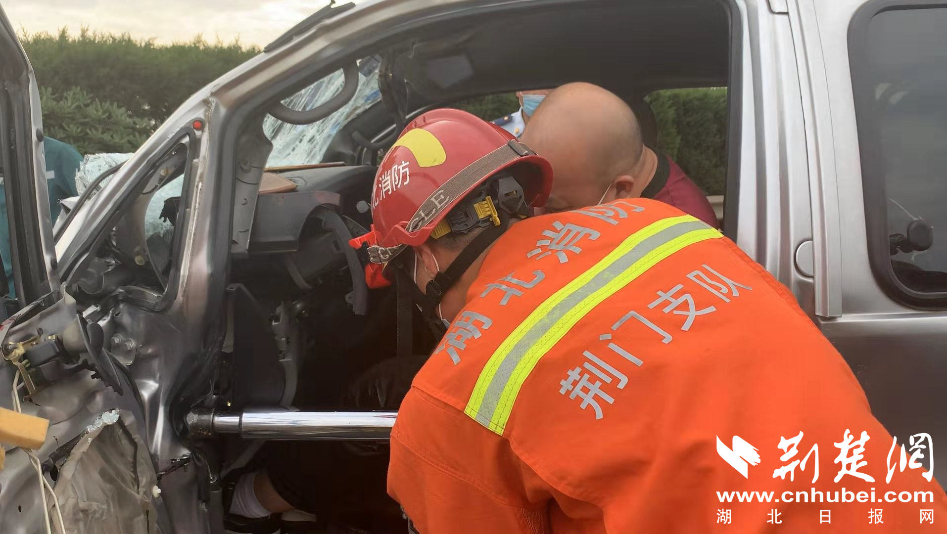 荆楚网客户端—荆楚网消息(通讯员 廖利雨 )5月14日16时21分,长坂坡路特勤站接到指挥中心调令:二广高速十里铺镇往荆门方向1727公里处一小车追尾,有人员被困。接到出动命令后,长坂坡路特勤站迅速出动2车10人赶赴事故现场处置。