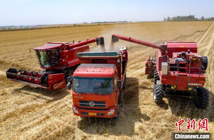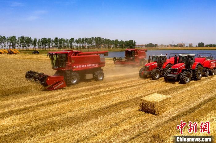 5月18日,在湖北省襄阳市襄州区古驿镇李岗村,鄂襄豪森谷物种植专业合作社的农机手驾驶收割机正在田间作业。眼下,襄阳市546万余亩小麦陆续进入丰收期,当地组织收割机、秸秆捡拾打捆机、秸秆自动搂拾机、播种机等多种农机,进行联合收割作业,回收的秸秆经加工转化后变废为宝,应用于农业种植养殖、生物质发电、工业产品加工等行业。襄阳是全国产粮大市,也是长江流域第一个百亿斤产粮大市。