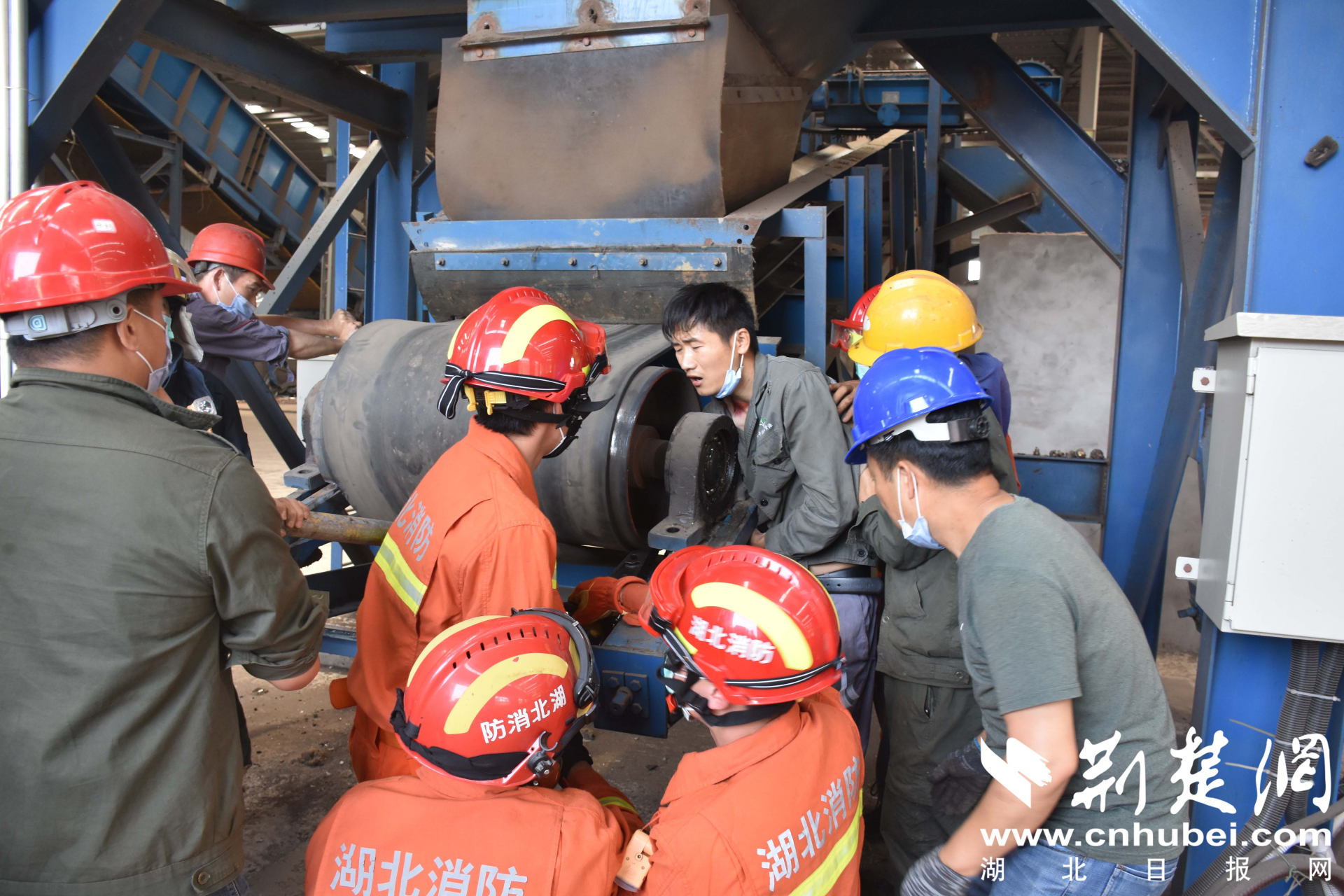 荆楚网客户端—荆楚网消息(通讯员 张磊)5月19日下午,宜昌市猇亭区一家企业的一名员工在对设备进行调试时, 手臂被运行中的传送带滚筒卡住,无法动弹,情况十分紧急。宜昌市金岭路消防救援站立即派出消防员赶往现场救援。
