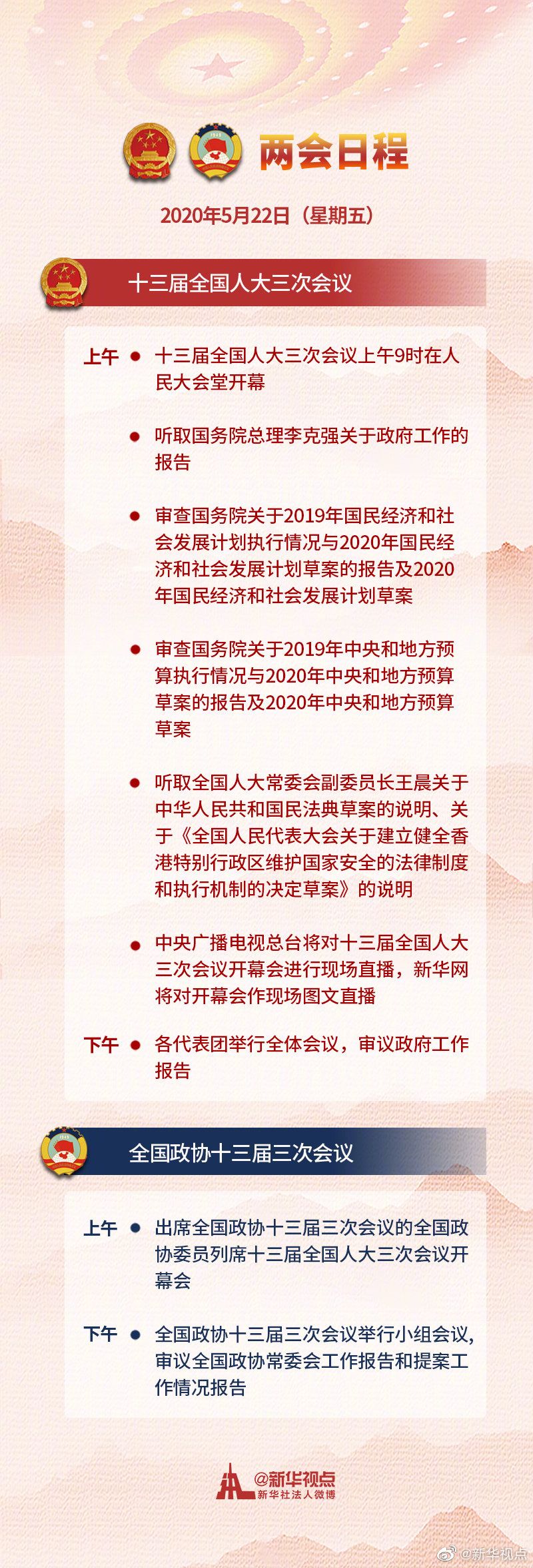 新华社北京5月21日电 十三届全国人大三次会议22日上午9时在人民大会堂开幕,听取国务院总理李克强关于政府工作的报告,审查国务院关于2019年国民经济和社会发展计划执行情况与2020年国民经济和社会发展计划草案的报告及2020年国民经济和社会发展计划草案,审查国务院关于2019年中央和地方预算执行情况与2020年中央和地方预算草案的报告及2020年中央和地方预算草案,听取全国人大常委会副委员长王晨关于中华人民共和国民法典草案的说明、关于全国人民代表大会关于建立健全香港特别行政区维护国家安全的法律制度和执行机制的决定草案的说明。下午,各代表团举行全体会议,审议政府工作报告。