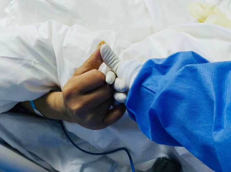 比如,他参与救治的“神奇病人”老徐。70岁的老徐是武汉人,危重症患者,一家九口都被感染了,只有他是危重症,一度处于插管深昏迷状态。但当周剑平带来其家属“一定要坚持下去”的叮嘱时,毫无知觉的老徐竟流泪了,这让所有医务人员都坚定了一定要把他抢回来的决心。